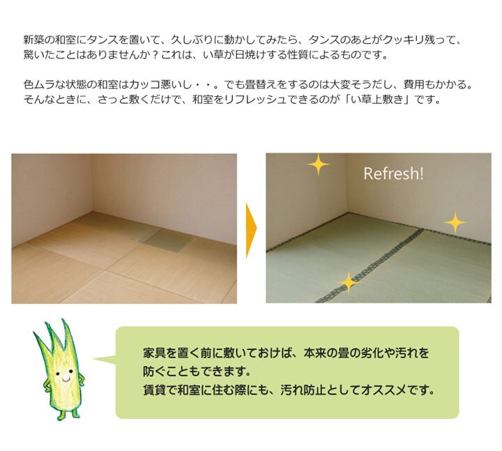 上敷きを敷くだけで畳のお部屋をリフレッシュ出来ます。日焼けしてしまった畳のリフレッシュに、新品の畳を汚さないためのカバーにご使用下さい。長さ105~110cmの国産(九州産)い草を使用しています。そのうち約85cmを使用しています。ヘリ際はある程度白みを帯びます。(日焼けではありません、い草の根元と先端部分の色です。)い草は先端部分が赤茶色く、根元が白く真中が青(緑)色です。真中の良質な青の部分を多く使用するほど、丈夫で綺麗な仕上がりとなります。またイ草は使用するうちに日焼けをしますが、真中の青の部分を多く使用した物ほど全体が綺麗に日焼けし、味が出ます。国産(九州産)のい草を使用しています。