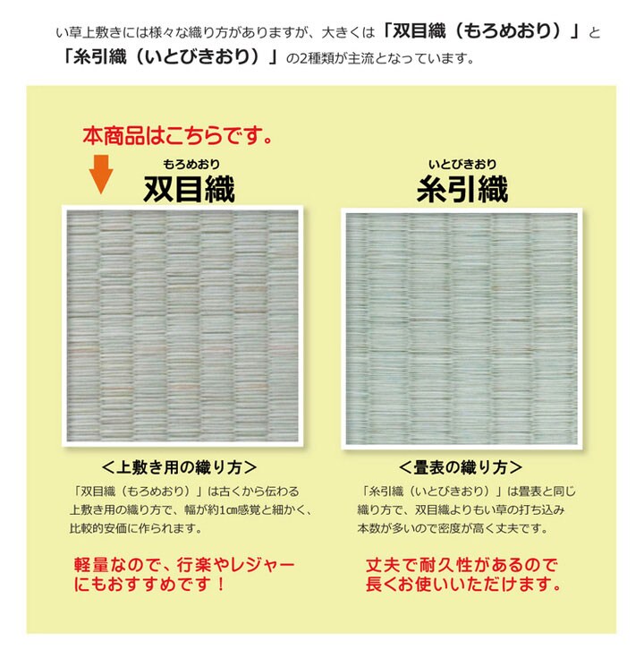 上敷きを敷くだけで畳のお部屋をリフレッシュ出来ます。日焼けしてしまった畳のリフレッシュに、新品の畳を汚さないためのカバーにご使用下さい。長さ110~115cmの国産(九州産)い草を使用しています。そのうち約91cmを使用しています。ヘリ際はある程度白みを帯びます。(日焼けではありません、い草の根元と先端部分の色です。)い草は先端部分が赤茶色く、根元が白く真中が青(緑)色です。真中の良質な青の部分を多く使用するほど、丈夫で綺麗な仕上がりとなります。またイ草は使用するうちに日焼けをしますが、真中の青の部分を多く使用した物ほど全体が綺麗に日焼けし、味が出ます。国産(九州産)のい草を使用しています。