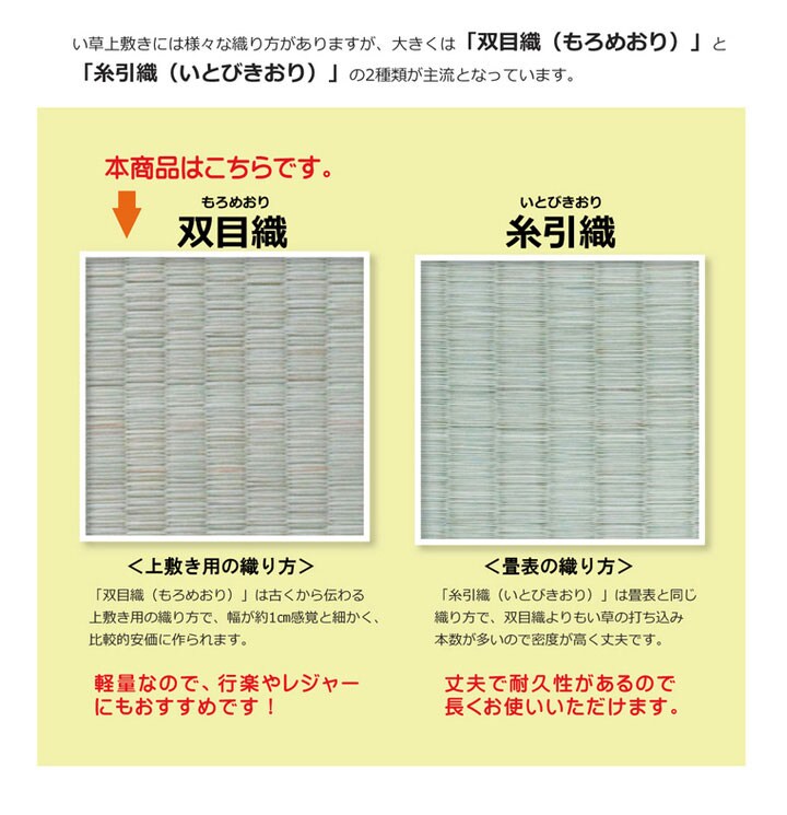 表地=い草(九州産) ※双目織 ヘリ=ポリプロピレン、ポリエチレン