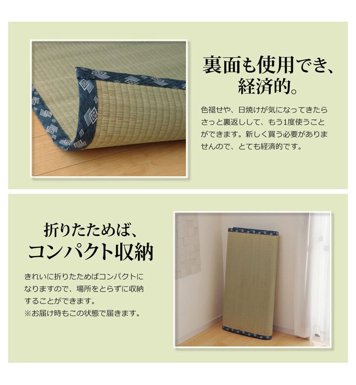 上敷きを敷くだけで畳のお部屋をリフレッシュ出来ます。日焼けしてしまった畳のリフレッシュに、新品の畳を汚さないためのカバーにご使用下さい。長さ115~120cmの国産(九州産)い草を使用しています。そのうち約88cmを使用しています。ヘリ際は多少白みを帯びます。(日焼けではありません、い草の根元と先端部分の色です。)い草は先端部分が赤茶色く、根元が白く真中が青(緑)色です。真中の良質な青の部分を多く使用するほど、丈夫で綺麗な仕上がりとなります。またイ草は使用するうちに日焼けをしますが、真中の青の部分を多く使用した物ほど全体が綺麗に日焼けし、味が出ます。国産(九州産)のい草を使用しています。