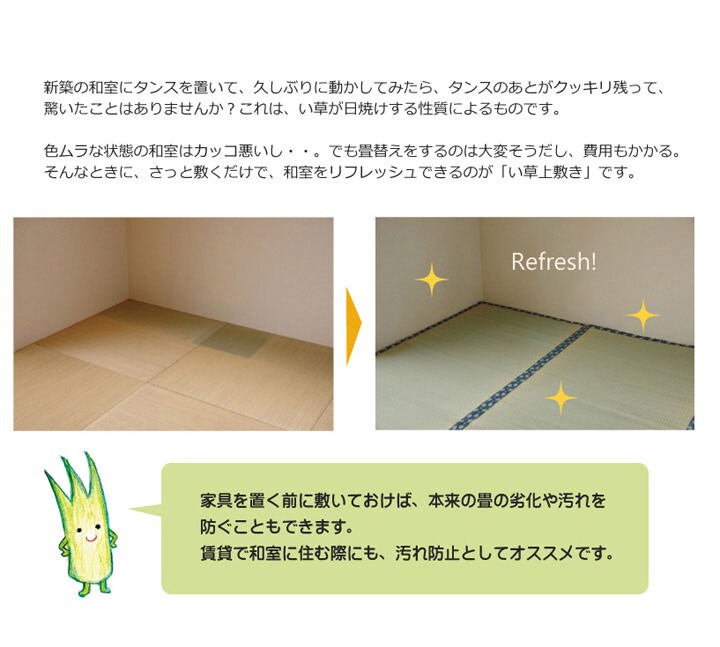 上敷きを敷くだけで畳のお部屋をリフレッシュ出来ます。日焼けしてしまった畳のリフレッシュに、新品の畳を汚さないためのカバーにご使用下さい。長さ115~120cmの国産(九州産)い草を使用しています。そのうち約88cmを使用しています。ヘリ際は多少白みを帯びます。(日焼けではありません、い草の根元と先端部分の色です。)い草は先端部分が赤茶色く、根元が白く真中が青(緑)色です。真中の良質な青の部分を多く使用するほど、丈夫で綺麗な仕上がりとなります。またイ草は使用するうちに日焼けをしますが、真中の青の部分を多く使用した物ほど全体が綺麗に日焼けし、味が出ます。国産(九州産)のい草を使用しています。