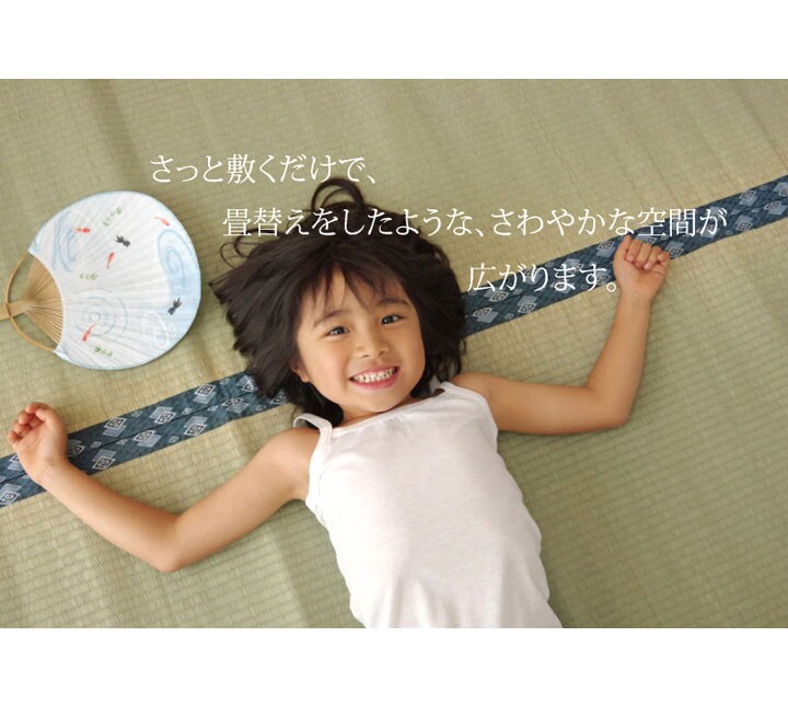 上敷きを敷くだけで畳のお部屋をリフレッシュ出来ます。日焼けしてしまった畳のリフレッシュに、新品の畳を汚さないためのカバーにご使用下さい。長さ120cm程の国産(九州産)い草を使用しています。そのうち約91cmを使用しています。ヘリ際は多少白みを帯びます。(日焼けではありません、い草の根元と先端部分の色です。)い草は先端部分が赤茶色く、根元が白く真中が青(緑)色です。真中の良質な青の部分を多く使用するほど、丈夫で綺麗な仕上がりとなります。またイ草は使用するうちに日焼けをしますが、真中の青の部分を多く使用した物ほど全体が綺麗に日焼けし、味が出ます。国産(九州産)のい草を使用しています。