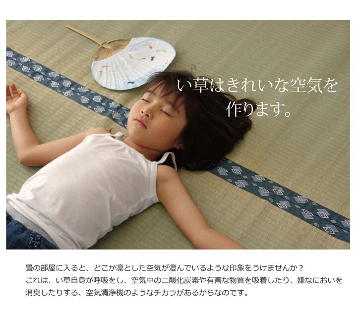 上敷きを敷くだけで畳のお部屋をリフレッシュ出来ます。日焼けしてしまった畳のリフレッシュに、新品の畳を汚さないためのカバーにご使用下さい。長さ120cm程の国産(九州産)い草を使用しています。そのうち約91cmを使用しています。ヘリ際は多少白みを帯びます。(日焼けではありません、い草の根元と先端部分の色です。)い草は先端部分が赤茶色く、根元が白く真中が青(緑)色です。真中の良質な青の部分を多く使用するほど、丈夫で綺麗な仕上がりとなります。またイ草は使用するうちに日焼けをしますが、真中の青の部分を多く使用した物ほど全体が綺麗に日焼けし、味が出ます。国産(九州産)のい草を使用しています。