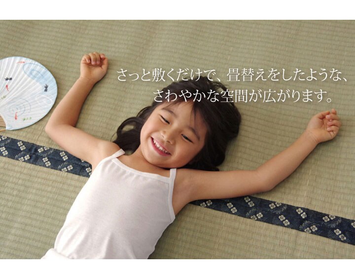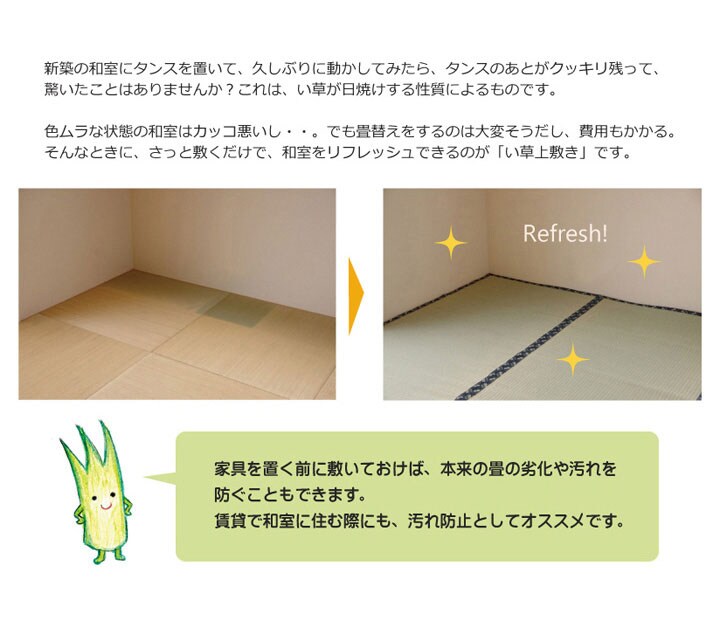 日焼けしてしまった畳のリフレッシュに、新品の畳を汚さないためのカバーにご使用下さい。長さ120cm以上の長い国産(九州産)い草を使用しています。そのうち約95cmを使用しています。ヘリ際の白い部分が少ない、長いイ草を使用した高級な商品です。(白い部分は日焼けではありません、い草の根元と先端部分の色です。い草は先端部分が赤茶色く、根元が白く真中が青(緑)色です。真中の良質な青の部分を多く使用するほど、丈夫で綺麗な仕上がりとなります。またイ草は使用するうちに日焼けをしますが、真中の青の部分を多く使用した物ほど全体が綺麗に日焼けし、味が出ます。こちらの商品は畳表と同じ織り方の糸引織で仕上げました。双目織りと比べて、い草の打ち込み本数が多いため丈夫です。表面が滑らかなので、ホコリなどがたまりにくいのが特徴です。国産(九州産)のい草を使用しています。