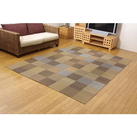 いろいろな織りを組み合わせたパッチワーク風のい草カーペットです。織り方によって違う複数の肌感触をお楽しみ頂けます。落ち着いた色目でモダンな雰囲気に仕上げました。縦糸の本数が多い袋織りという技法で繊細な柄を出しています。折れ曲がりが複雑なので長いイ草を使用しないと切れてしまいます。縦糸が密なので、しっかりとして破れにくいのが特徴です。国産(九州産)のい草を使用しています。一本一本が太く、表皮が厚く繊維がキメ細かいので弾力性があり、耐久性に優れています。い草には空気の自然浄化作用、湿度の調節作用などがあります。また汚れにくく、使用するうちに黄金色に変化し味が出ます。い草に青森ヒバ加工を施しています。(抗菌、防臭効果)
