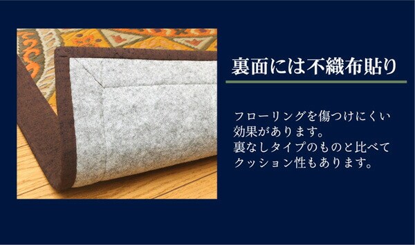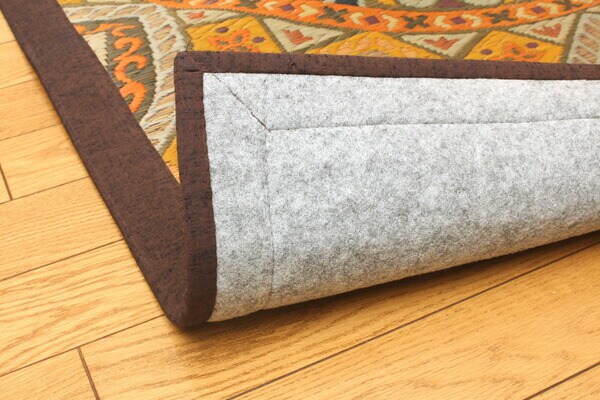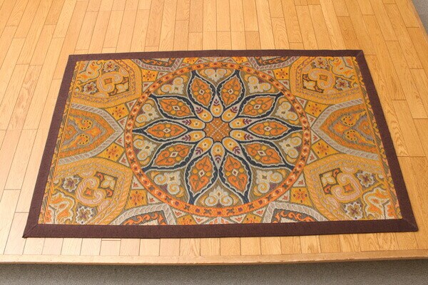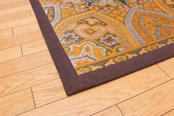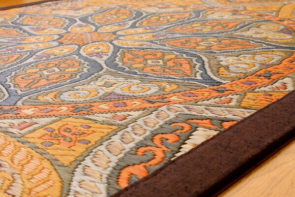 縦糸の本数が多い袋織りという技法で繊細な柄を出しています。折れ曲がりが複雑なので長いイ草を使用しないと切れてしまいます。縦糸が密なので、しっかりとして破れにくいのが特徴です。さらに七重に織ることで耐久性、ボリューム感、圧倒的な存在感のある商品に仕上げました。通常の敷物は二重織りで一直線上に2色しか色を出せないのに対し、7重織りは7色の色出せますのでより鮮やかで繊細な柄を出すことが出来ます。さらに退色しにくい立花染めという技法でイ草を染めて深い色合いに仕上げています。たて糸は通常の国産の敷物に使用される約1.3倍の太さの糸を使用している為、糸自体の耐久性に優れ、生地表面の目立ちもハッキリとしています。ヘリ生地は久留米織りの生地を使用しています。久留米織りとは福岡県久留米地方の伝統的な織りも物で、着物や洋服によく使われている貴重な織り物です。7重織りの商品を仕上げるのには特に熟練された技術が必要で、限られた職人さんでしか織りあげることが出来ません。また一日に約4枚しか生産が出来ない希少価値のある商品です。国産(九州産)のい草を使用しています。一本一本が太く、表皮が厚く繊維がキメ細かいので弾力性があり、耐久性に優れています。い草には空気の自然浄化作用、湿度の調節作用などがあります。また汚れにくく、使用するうちに黄金色に変化し味が出ます。い草に青森ヒバ加工を施しています。(抗菌、防臭効果)裏には不織布を貼っていますので適度なクッション性があり、フローリングでの使用にも適しています。