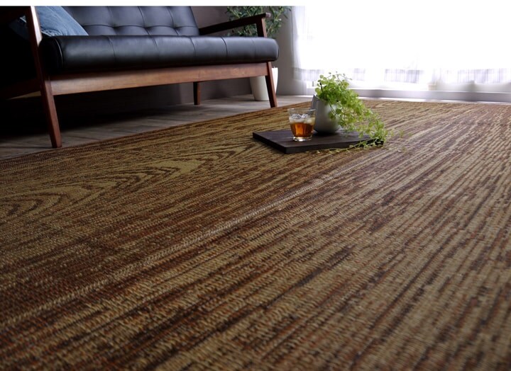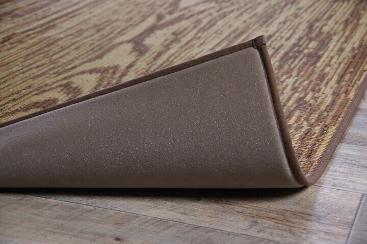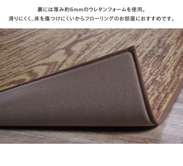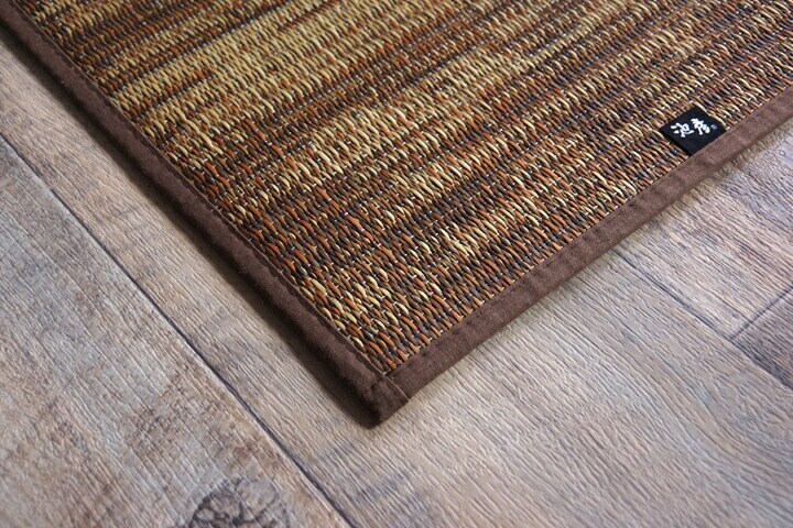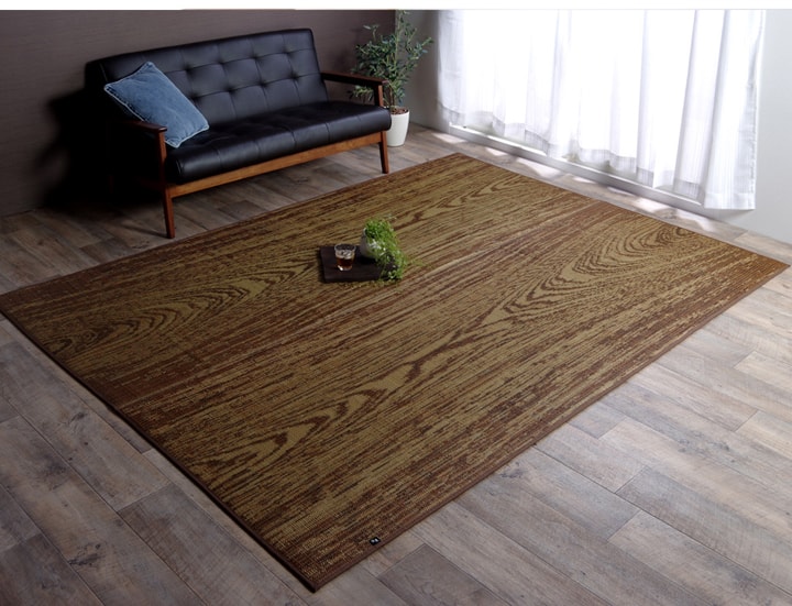 まるで木の一枚板のようない草カーペットです。繊細な色使いと織りで木の温かみや深みを表現しました。国産(九州産)のい草を使用しており、一本一本が太く、表皮が厚く繊維がキメ細かいので弾力性があり、耐久性に優れています。い草には空気の自然浄化作用、湿度の調節作用などがあります。また汚れにくく、使用するうちに黄金色に変化し味が出ます。裏にはウレタンを貼っていますのでフローリングでのご使用にも適しています。い草に青森ヒバ加工を施しています。(抗菌、防臭効果)