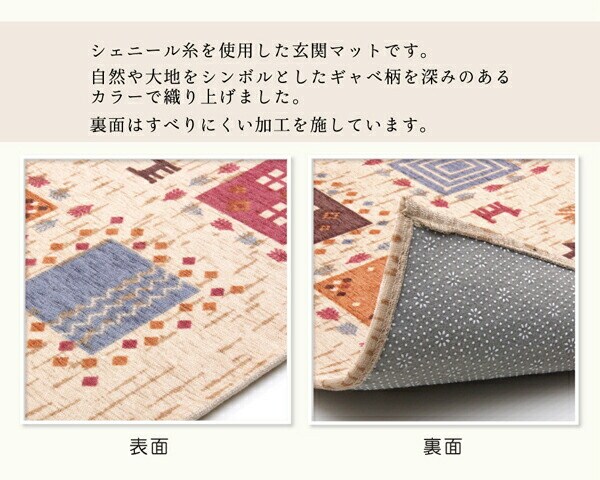 シェニール糸を使用した玄関マットです。シンプルなギャベ柄をあしらい、清潔感のあるアイボリーは玄関をぱっと明るく演出してくれます。裏面にはすべりにくい加工を施しています。