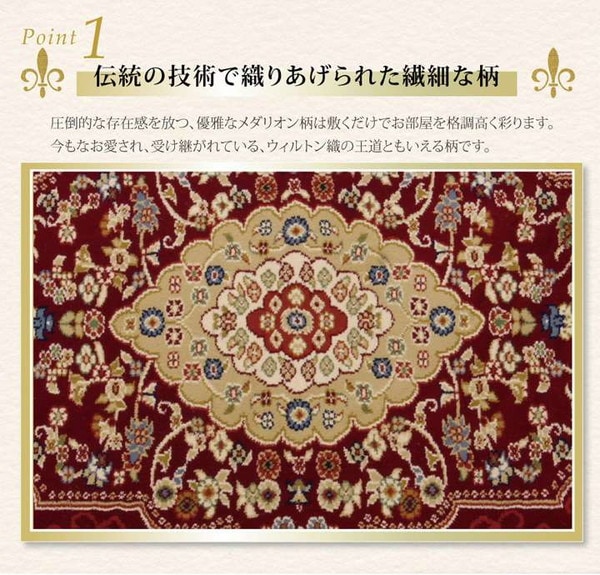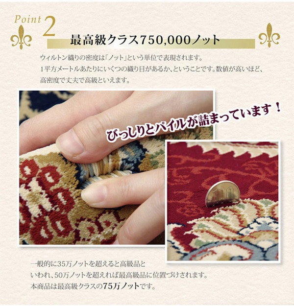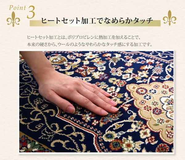 ぎっしりとパイルが詰まっていますので弾力性に富み踏み心地もしっかりとしています。また、パイル数を多くすることにより、より繊細でより色鮮やかなメダリオン柄を表現しました。プリントものには出せない高級感・重厚感のある繊細な柄をお楽しみ下さい。本商品のパイル部分にはポリプロピレン素材を使用しております。ポリプロピレンはヘタリにくく、耐久性に優れ、繊維の中でも軽い素材です。