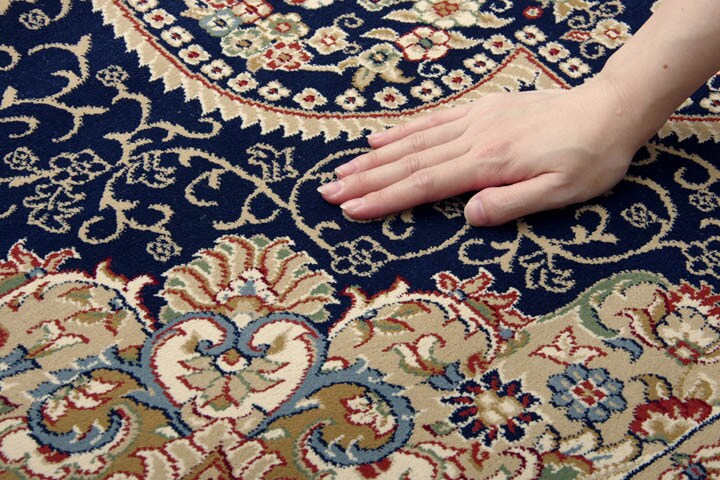 ぎっしりとパイルが詰まっていますので弾力性に富み踏み心地もしっかりとしています。また、パイル数を多くすることにより、より繊細でより色鮮やかなメダリオン柄を表現しました。プリントものには出せない高級感・重厚感のある繊細な柄をお楽しみ下さい。本商品のパイル部分にはポリプロピレン素材を使用しております。ポリプロピレンはヘタリにくく、耐久性に優れ、繊維の中でも軽い素材です。また、汚れが付着しにくく、遊び毛や毛玉が非常に出にくいという特徴もあります。本商品にはヒートセット加工を施しております。ヒートセット加工をすることで、柔らかく、なめらかなタッチ感に仕上げました。ホットカーペットカバーや床暖房にも対応しております。安心して年間お使い頂けるカーペットです。