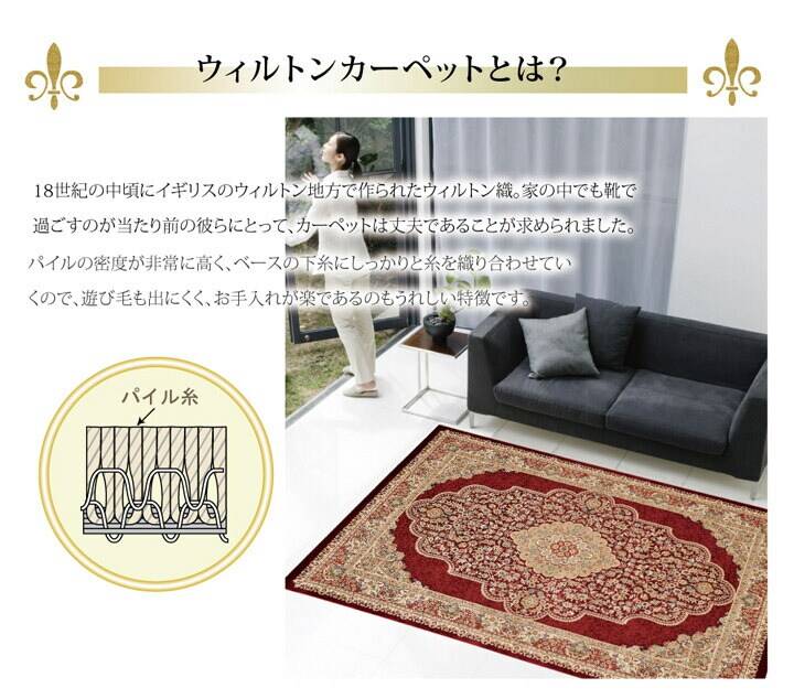 ぎっしりとパイルが詰まっていますので弾力性に富み踏み心地もしっかりとしています。また、パイル数を多くすることにより、より繊細でより色鮮やかなメダリオン柄を表現しました。プリントものには出せない高級感・重厚感のある繊細な柄をお楽しみ下さい。本商品のパイル部分にはポリプロピレン素材を使用しております。ポリプロピレンはヘタリにくく、耐久性に優れ、繊維の中でも軽い素材です。また、汚れが付着しにくく、遊び毛や毛玉が非常に出にくいという特徴もあります。本商品にはヒートセット加工を施しております。ヒートセット加工をすることで、柔らかく、なめらかなタッチ感に仕上げました。ホットカーペットカバーや床暖房にも対応しております。安心して年間お使い頂けるカーペットです。※玄関などでご使用の際は、市販のスベリ止めシートなどの併用をおすすめします。