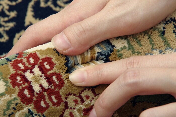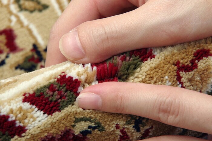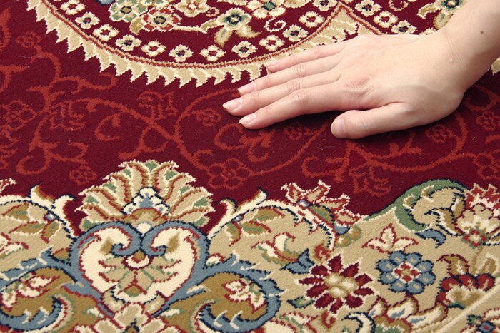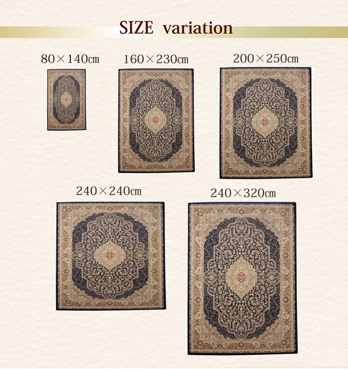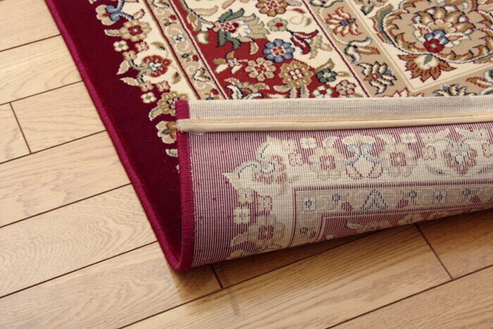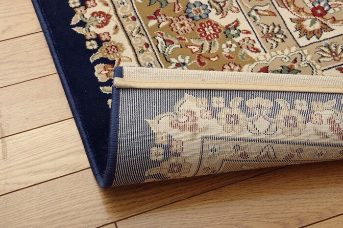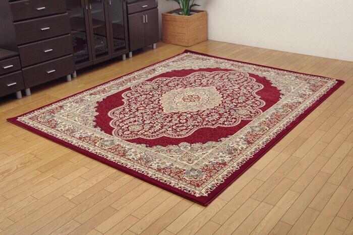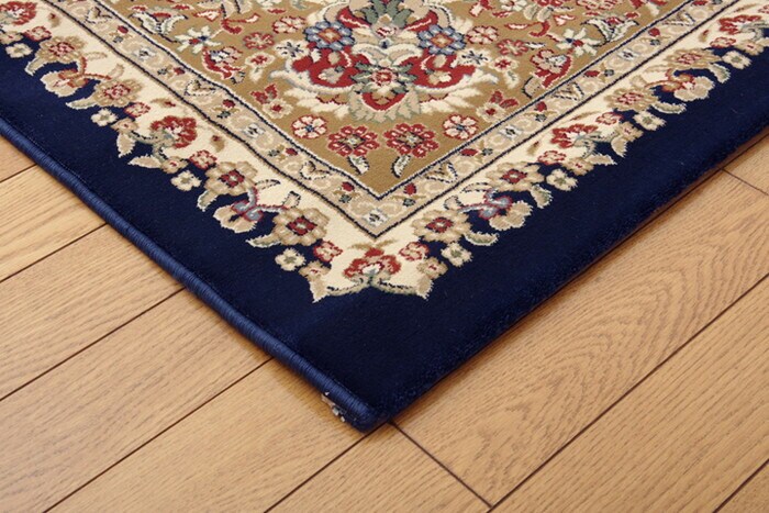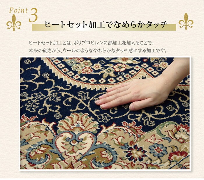 トルコ製の最高級ウィルトン織りカーペットです。ウィルトン織りは、非常に耐久性の高いカーペットです。家の中でも靴を履いて生活するヨーロッパで、土足で扱うことを前提として作られておりますので、長時間踏みつけてもヘタリにくく、弾力性もあり長くご使用頂けます。また、高密度にパイルを織り上げることで、耐久性プラス繊細な柄を表現できるのも特徴です。本商品の『繊維の密度を表すノット数』は75万ノットの最高級クラスです。ぎっしりとパイルが詰まっていますので弾力性に富み踏み心地もしっかりとしています。また、パイル数を多くすることにより、より繊細でより色鮮やかなメダリオン柄を表現しました。プリントものには出せない高級感・重厚感のある繊細な柄をお楽しみ下さい。本商品のパイル部分にはポリプロピレン素材を使用しております。ポリプロピレンはヘタリにくく、耐久性に優れ、繊維の中でも軽い素材です。また、汚れが付着しにくく、遊び毛や毛玉が非常に出にくいという特徴もあります。本商品にはヒートセット加工を施しております。ヒートセット加工をすることで、柔らかく、なめらかなタッチ感に仕上げました。ホットカーペットカバーや床暖房にも対応しております。安心して年間お使い頂けるカーペットです。