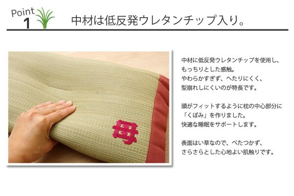 より頭にフィットするよう、枕の中心部分に「くぼみ」をつくりました。快眠い草の効能として1.綿の約2.5倍の吸湿力 2.蒸れにくい。汗による湿気を吸うことにより温度を下げ快適な就寝を促します。 3.汗のにおいを軽減。汗のにおいの元となる化学物質を90%以上抑えます。などがあります。国産(九州産)のしなやかなイ草を使用していますので、柔らかく、すべすべしたとした肌触りです。