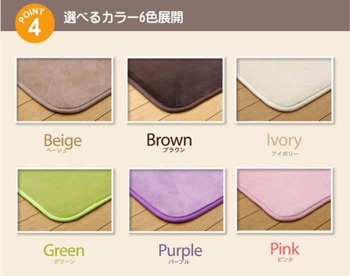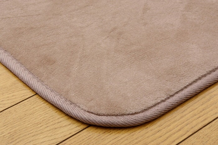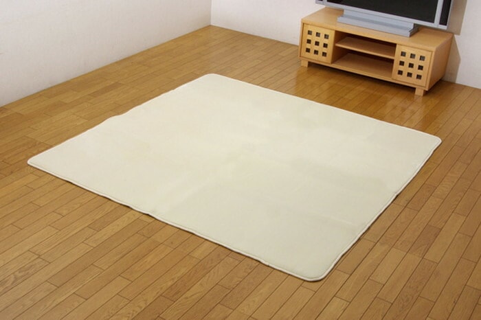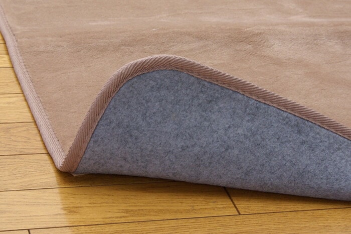 表地にフランネル糸と呼ばれる繊維を使用し、なめらかなでしっとりとした肌触りに仕上げました。又表地には撥水加工を施しており、万が一水などをこぼしても表面張力で水玉状に汚れをはじき、染み込みにくいのでお手入れが簡単です。中材にはウレタンを5mm使用しており適度なクッション性があります。裏地にはフローリングを傷付けにくい不織布を貼っています。秋冬シーズンにはホットカーペットカバーとしてもご使用頂けます。