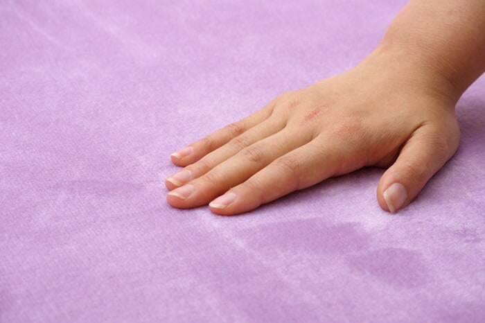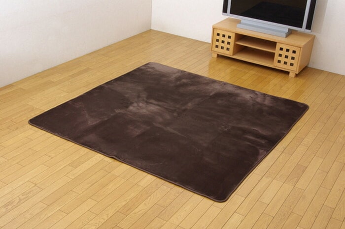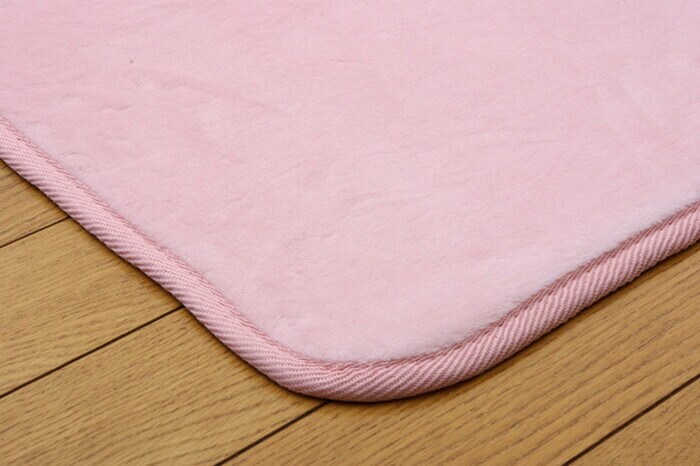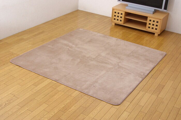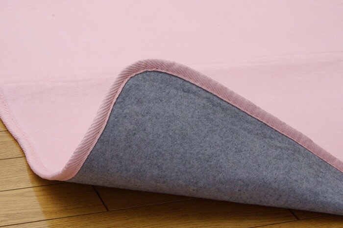 表地にフランネル糸と呼ばれる繊維を使用し、なめらかなでしっとりとした肌触りに仕上げました。又表地には撥水加工を施しており、万が一水などをこぼしても表面張力で水玉状に汚れをはじき、染み込みにくいのでお手入れが簡単です。中材にはウレタンを5mm使用しており適度なクッション性があります。裏地にはフローリングを傷付けにくい不織布を貼っています。秋冬シーズンにはホットカーペットカバーとしてもご使用頂けます。