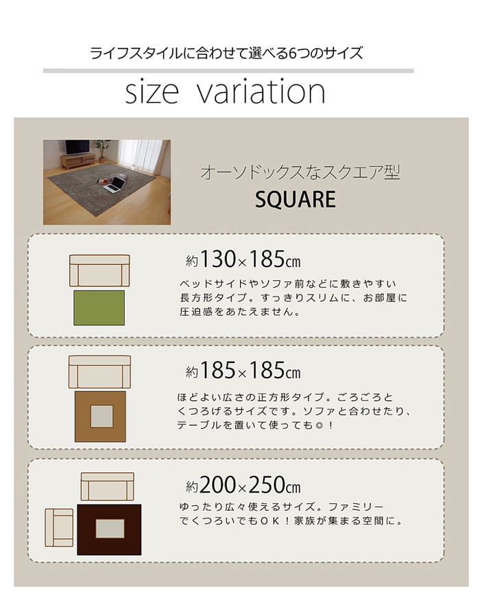 多サイズ展開でワンルームから子ども部屋、リビング・ダイニング、ベッドサイド、ソファー前にも、いろいろなシーンに合わせてお選び下さい。