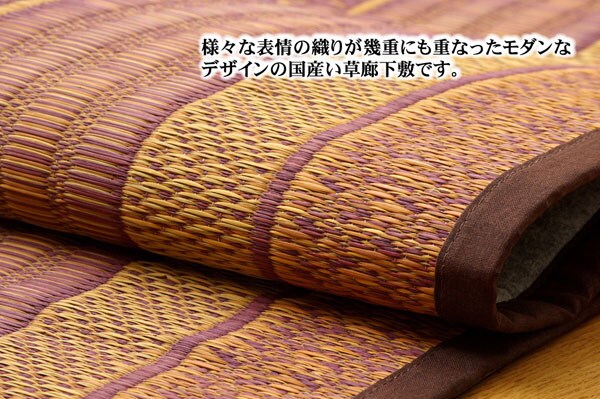 現代のライフスタイルに合う、洗練されたモダンなデザインの廊下敷きです。国産(九州産)のい草を使用しています。一本一本が太く、表皮が厚く繊維がキメ細かいので弾力性があり、耐久性に優れています。い草には空気の自然浄化作用、湿度の調節作用などがあります。また汚れにくく、使用するうちに黄金色に変化し味が出ます。い草に青森ヒバ加工を施しています。(抗菌、防臭効果)裏にはフローリングを傷つけにくいよう不織布を貼っています。