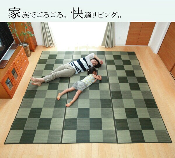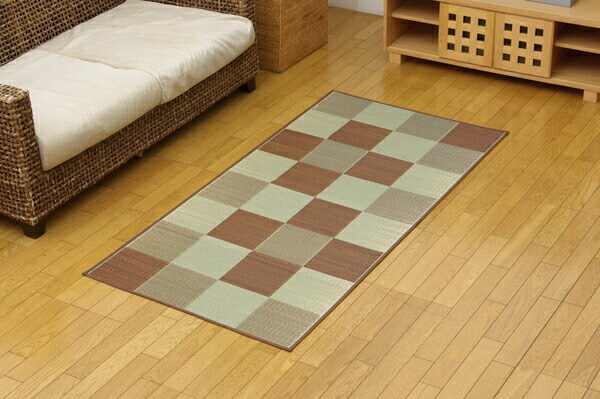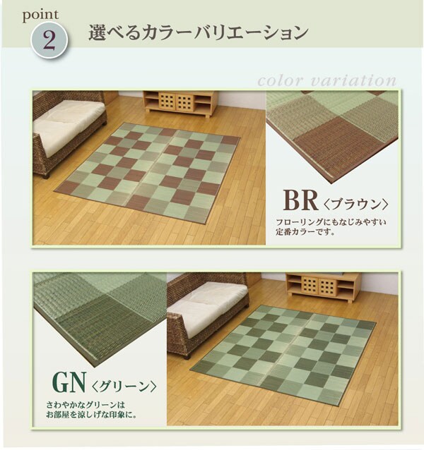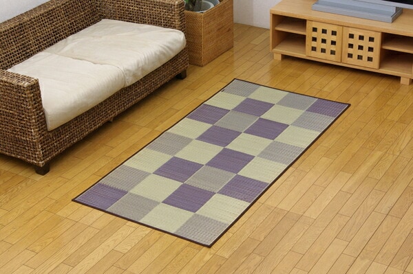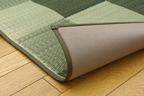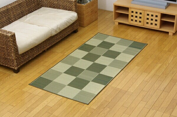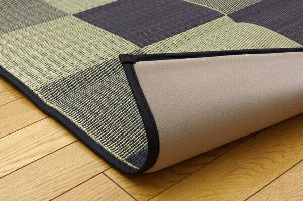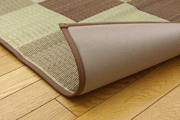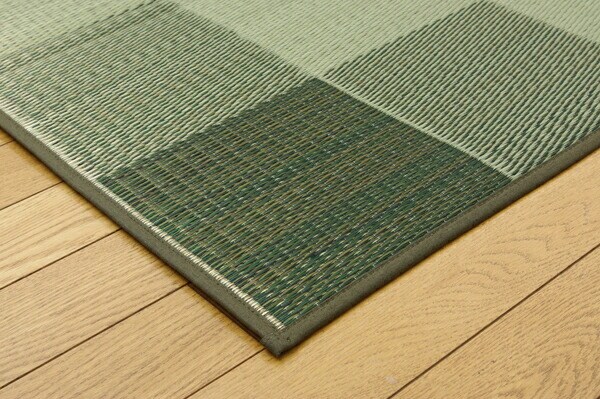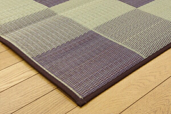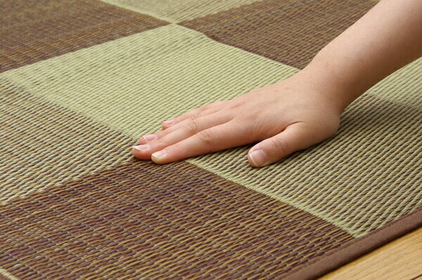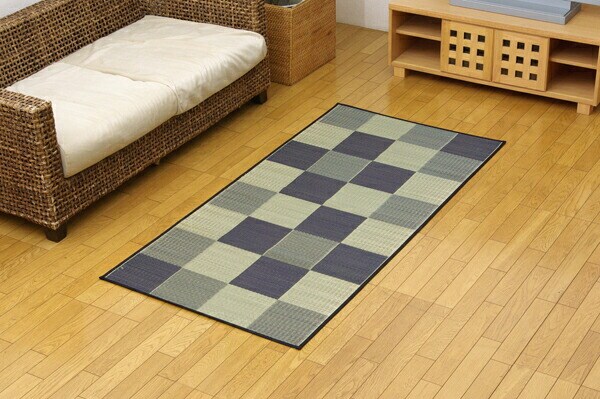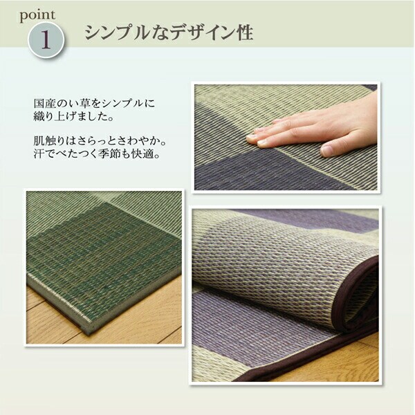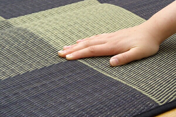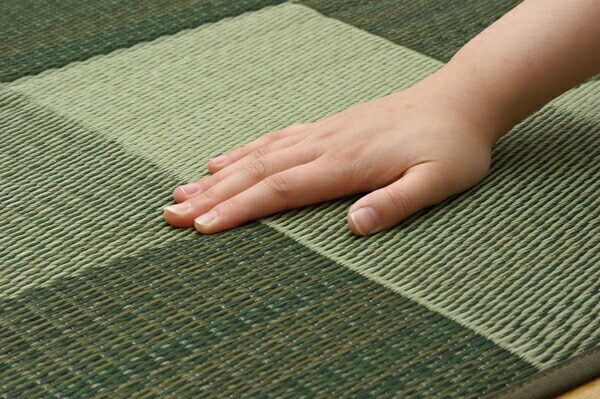 シンプルで飽きのこないブロック柄のい草カーペットです。国産(九州産)のい草を使用しています。一本一本が太く、表皮が厚く繊維がキメ細かいので弾力性があり、耐久性に優れています。い草には空気の自然浄化作用、湿度の調節作用などがあります。また汚れにくく、使用するうちに黄金色に変化し味が出ます。裏にはウレタンを貼っていますのでフローリングでのご使用にも適しています。い草に青森ヒバ加工を施しています。(抗菌、防臭効果)