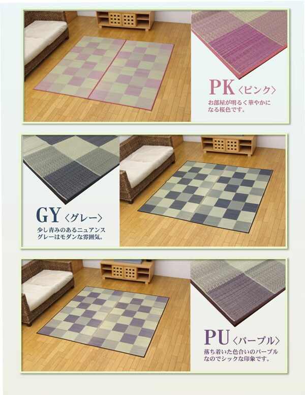 | ■シンプルで飽きのこないブロック柄のい草カーペットです。 ■ブラウン、グリーン、グレー、ピンク、パープルの5色展開です。お部屋に合わせてお好きな色をお選び下さい。 ■国産(九州産)のい草を使用しています。一本一本が太く、表皮が厚く繊維がキメ細かいので弾力性があり、耐久性に優れています。い草には空気の自然浄化作用、湿度の調節作用などがあります。また汚れにくく、使用するうちに黄金色に変化し味が出ます。 ■裏にはウレタンを貼っていますのでフローリングでのご使用にも適しています。 ■い草に青森ヒバ加工を施しています。(抗菌、防臭効果) ■掲載写真は表記サイズとは異なる場合がございます。 | |