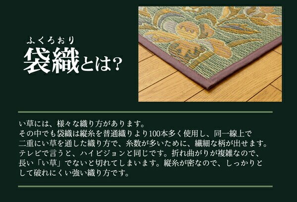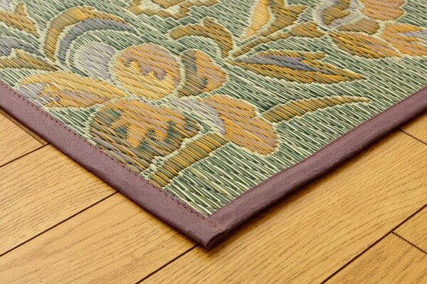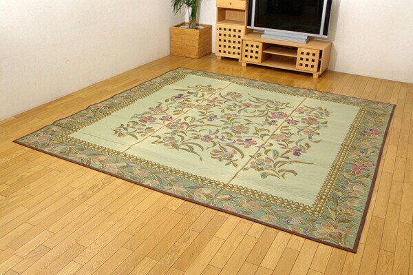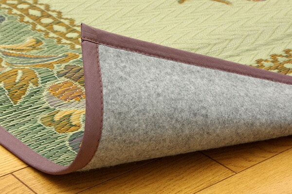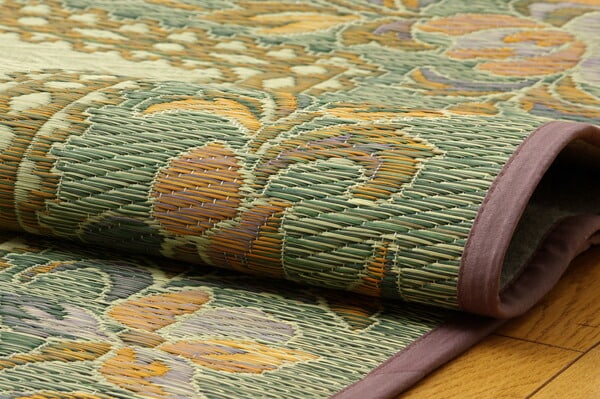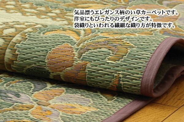 エレガンスな花柄のい草カーペットです。縦糸の本数が多い袋織りという技法で繊細な柄を出しています。折れ曲がりが複雑なので、長いイ草を使用しないと切れてしまいます。縦糸が密なので、しっかりとして破れにくいのが特徴です。い草には空気の自然浄化作用、湿度の調節作用などがあります。また汚れにくく、使用するうちに黄金色に変化し味が出ます。フローリングを傷つけにくいよう裏には不織布を貼っています。い草に青森ヒバ加工を施しています。(抗菌、防臭効果)