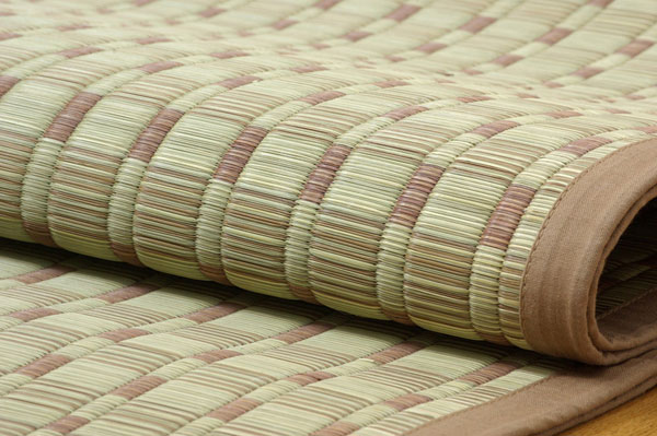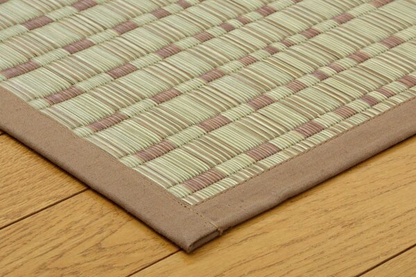 掛川織は九州筑後地方の伝統的な織り方です。大きな目と小さな目に交互に織り込んだ美しく洗練されたモダンなデザインが人気です。また、厳選された良質の太く長いイ草を高密度に織り込んでいますので丈夫で耐久性があり、しかも素足に心地よいクッション性とボリューム感があります。国産(九州産)のい草を使用しています。一本一本が太く、表皮が厚く繊維がキメ細かいので弾力性があり、耐久性に優れています。い草には空気の自然浄化作用、湿度の調節作用などがあります。また汚れにくく、使用するうちに黄金色に変化し味が出ます。い草に青森ヒバ加工を施しています。(抗菌、防臭効果)