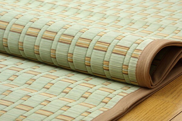 い草敷物の中でも高級品とされる「掛川織り」のカーペットです。掛川織は九州筑後地方の伝統的な織り方です。大きな目と小さな目に交互に織り込んだ美しく洗練されたモダンなデザインが人気です。また、厳選された良質の太く長いイ草を高密度に織り込んでいますので丈夫で耐久性があり、しかも素足に心地よいクッション性とボリューム感があります。。い草に青森ヒバ加工を施しています。(抗菌、防臭効果)