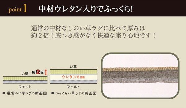 クッション性にこだわったイ草カーペットです。クッション性、耐圧分散性に優れたウレタンを、イ草と不織布でサンドしました。プニプニとしてとても柔らかく、フローリングのお部屋に最適です。遮音特級LL45を取得しており、床下への騒音を軽減する効果があります。ホットカーペットカバーとしても使用できます。い草に青森ヒバ加工を施しています。(抗菌、防臭効果)