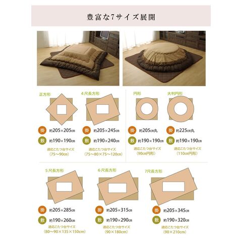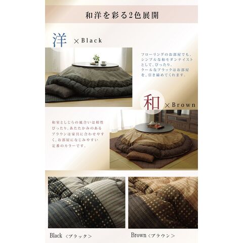 | ■ロングセラーのしじら織のこたつ布団です。べとつかず肌触りの良いしじら織で和室にも洋室にも合うデザインに仕上げました。 ■部分暖房のこたつは電気代もお得です。 | |