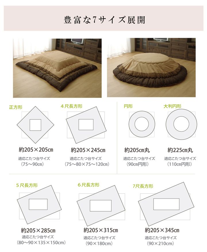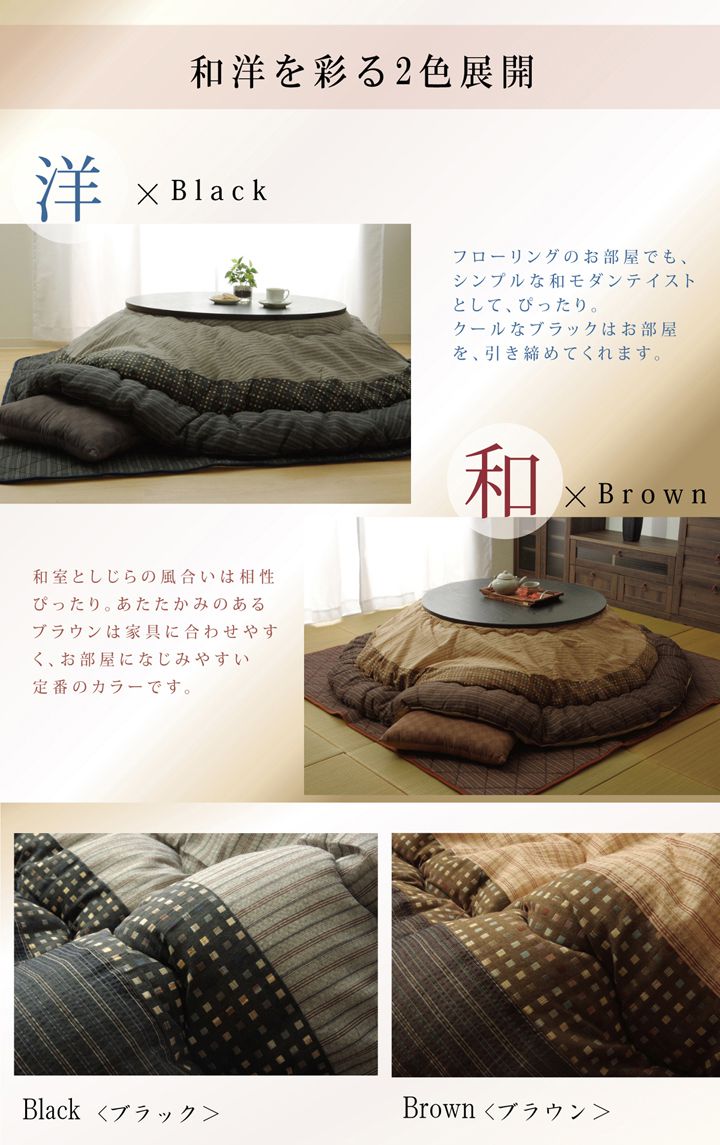 | ■ロングセラーのしじら織のこたつ布団です。べとつかず肌触りの良いしじら織で和室にも洋室にも合うデザインに仕上げました。 ■部分暖房のこたつは電気代もお得です。 | |