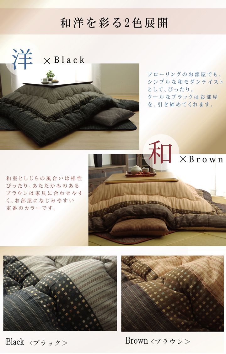 ロングセラーのしじら織のこたつ布団です。べとつかず肌触りの良いしじら織で和室にも洋室にも合うデザインに仕上げました。部分暖房のこたつは電気代もお得です。