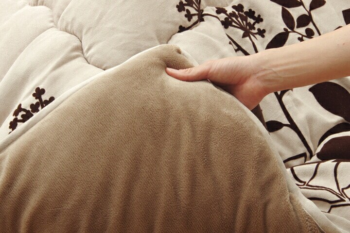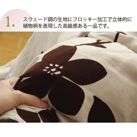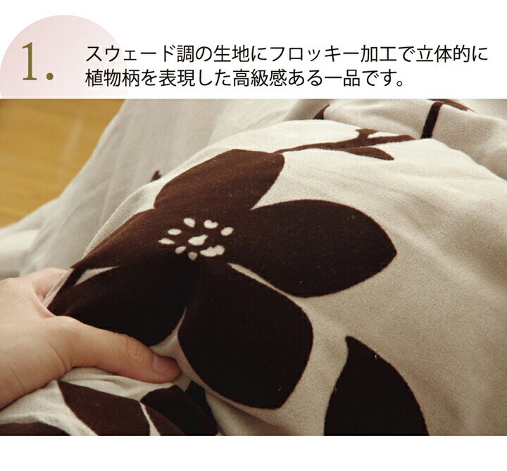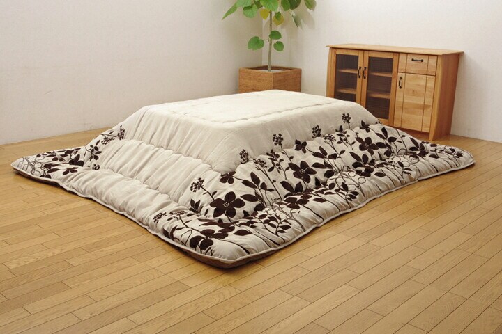 シンプルなリーフ柄をあしらった商品です。表地には肌触りやわらかなフランネルを使用しました。部分暖房のこたつは電気代もお得です。