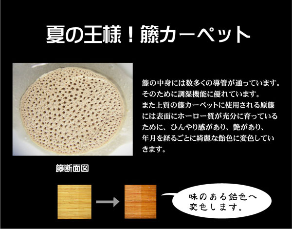インドネシア原産の3年~5年育成されたA級の籐(セガ籐)を使用している商品です。素材も均一化を図るため機械で一定の厚さに整えたものを使用しています。また本間1間(幅191cm)あたりに39穴と通常(通常規格は27~35穴)より糸数を増やしていますので、目が揃っていて肌触りがよく綺麗です。耐久性が高く、ホーロー質が育っているため天然のひんやり感と艶があり、使うほどに綺麗な飴色に変わっていきます。夏を快適に過ごす素材として長年重宝されています。裏地に青森ヒバ加工を施しています。(抗菌、防臭効果)