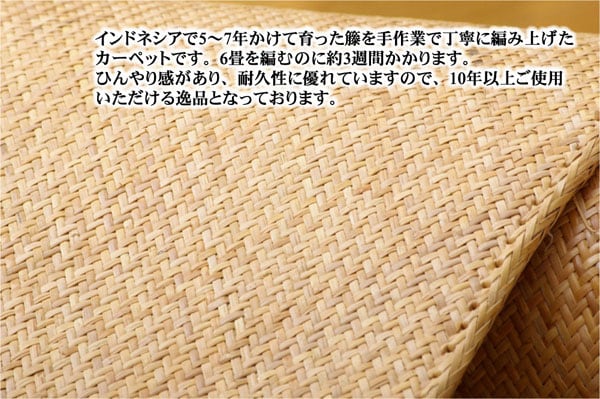 インドネシア原産の5年~7年育成された籐(ロンティ)を使用しているあじろ商品です。夏を快適に過ごす素材として長年重宝されています。6畳編むのに3週間かかる手の込んだあじろ織り独自の編み模様が高級感と涼感をかもしだすます。冷たくしなやかでとても肌触りがよく、籐だけで編んでいますのでとても長く10年以上使用できる逸品です。使い込むほどに綺麗な飴色に変化していきます。