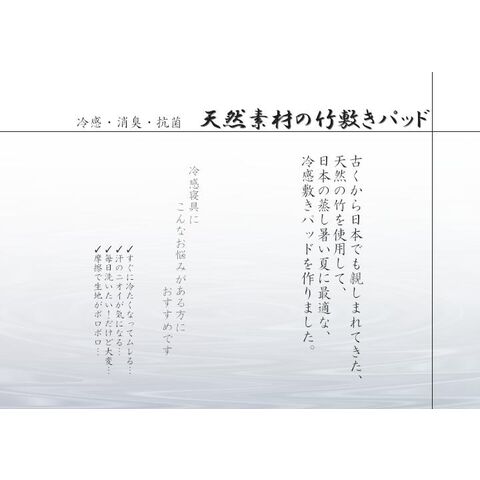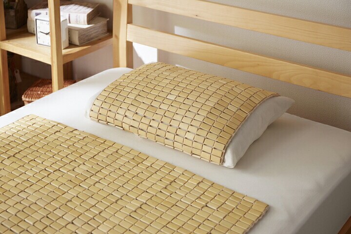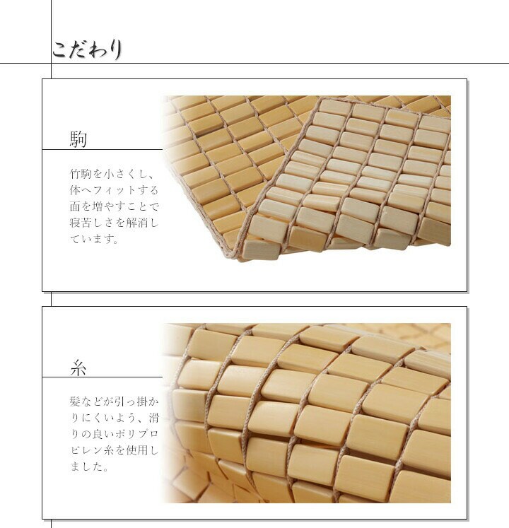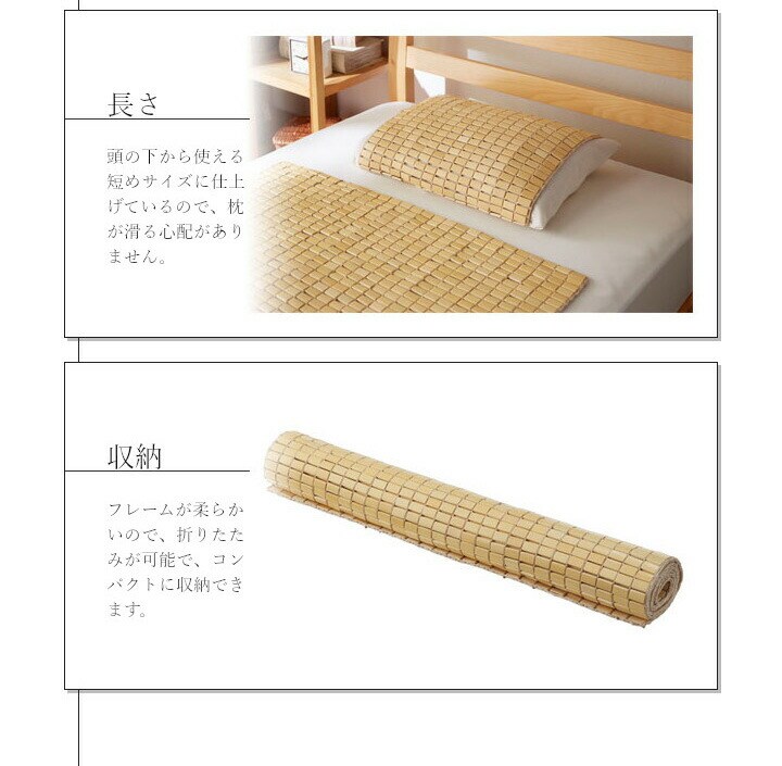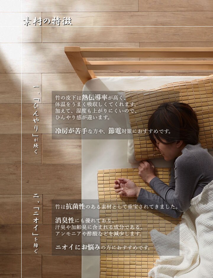 髪の毛や体毛がひっかかりにくいよう、フレームに柔らかいPPを使用した竹のシーツです。フレームが柔らかいので、どこからでも折りたたむことができ、コンパクトに収納できます。また竹駒のサイズは28mm×15mmと一般的なものよりひとまわり小さくしていますので、より体にフィットします。素材は麻雀竹の産地である福建省で育った天然の竹を使用しています。猛宗竹のひんやり感のある表面部分を使用しています。竹の表皮は、熱を吸収する機能に優れています。竹の持つこの特長が、ひんやりとした肌さわりをもたらします。綿素材と比較して体感温度が下がり、寝苦しい夜を快適にサポートしてくれます。マットレスなどの上に敷いてもぴったりとフィットして竹の硬さを感じません。竹の表面に天然青森ヒバ加工を施しています。(抗菌、防臭効果)青森県のヒバの木から抽出した「ヒバ油」を現地に送り、メーカー独自の技術で材料や商品に加工しました。「ヒバ油」には、ヒノキチオールという天然物質としては極めて抗菌性の高い成分が含まれ、医療や食品など多分野で利用研究が進められています。