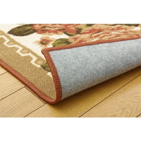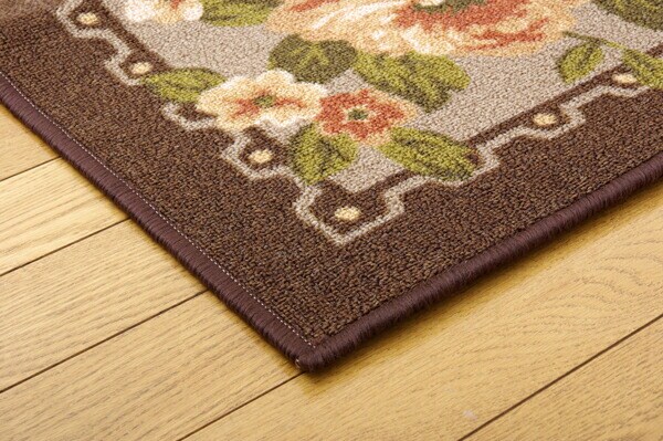 絵羽柄のカーペットです。表地には撥水加工を施しておりますので、汚れにくくお手入れも簡単です。表地のパイル部分にはナイロンを使用しています。ナイロンは強度や摩耗に強く、速乾性があり、また遊び毛も出にくいなどの特徴があります。ダイニングカーペットや敷き詰めカーペットとしてのご使用にも適しています。季節を選ばず、オールシーズンご使用頂けます。同柄のキッチンマットも取扱いがありますので、トータルでのコーディネートもお勧めです。