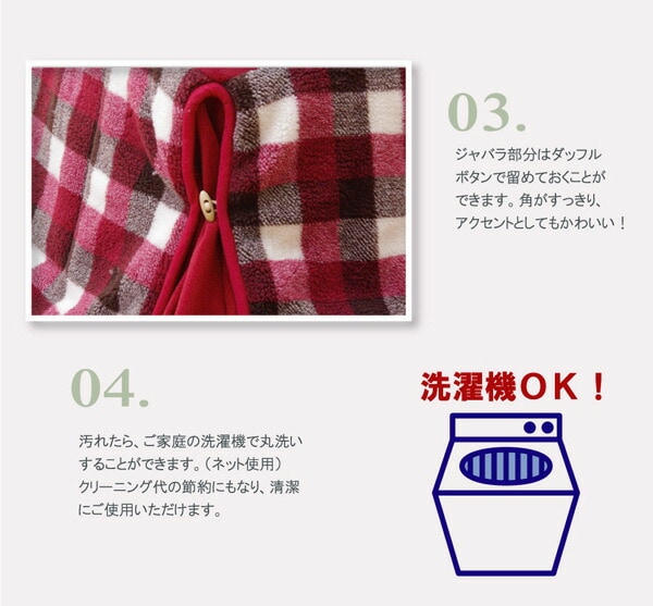 あたたかみのあるカラーと素材を使用したチェック柄のこたつ布団です。表地は糸を先に染色してから生地を織る技法を採用しておりますので、プリントものや後から染めるものとは違う上質な雰囲気があります。裏地には軽くて保温性の高いフリースを使用しています。省スペースタイプで角が膨らまず、お部屋を広く使えます。薄手なので折りたたんでもかさばらず、コンパクトに収納できます。部分暖房のコタツは電気代もおトクです。本商品はご家庭の洗濯機である洗い可能(ネット使用)ですので、いつでも清潔にご使用頂けます。