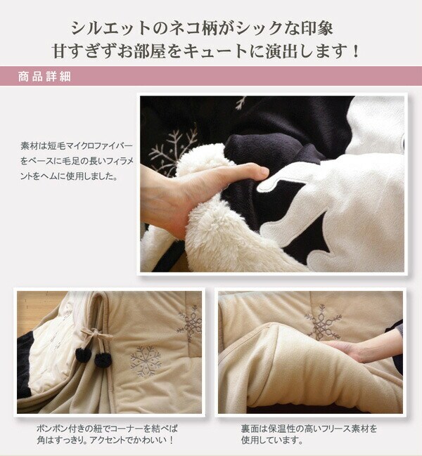 | ■人気のネコ柄のコタツ布団です。ネコの柄をシルエット調にし、雪の結晶はプリントではなく、刺繍で表現することで、甘くなりすぎず、シックな雰囲気に仕上げました。表地には耐久性に優れ、しっとりとやわらかな短毛のマイクロファイバー生地を使用しています。裏地には軽くて保温性の高いフリースを使用しています。省スペースタイプで角が膨らまず、お部屋を広く使えます。薄手なので折りたたんでもかさばらず、コンパクトに収納できます。部分暖房のコタツは電気代もおトクです。 ※写真は表記サイズと異なる場合がございます。 | |
