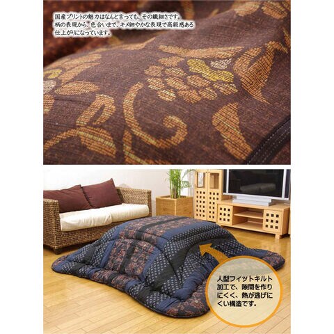 和モダン柄のこたつ布団です。熱が逃げにくいフィットキルト加工を施しています。生地に撥水加工を施しています。生地には肉厚で張りと光沢のある綿素材を使用しています。こちらの商品は国内でプリント、綿入れしています。日本製のプリントらしい上質な質感と繊細な文様をお楽しみ下さい。部分暖房のこたつは電気代もおトクです。