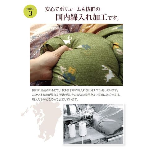 和調のウサギ柄こたつ布団です。こちらの商品は国内でわた入れをしています。側地にはポリエステル素材を起毛させた柔らかい生地を使用しています。部分暖房のこたつは電気代もおトクです。