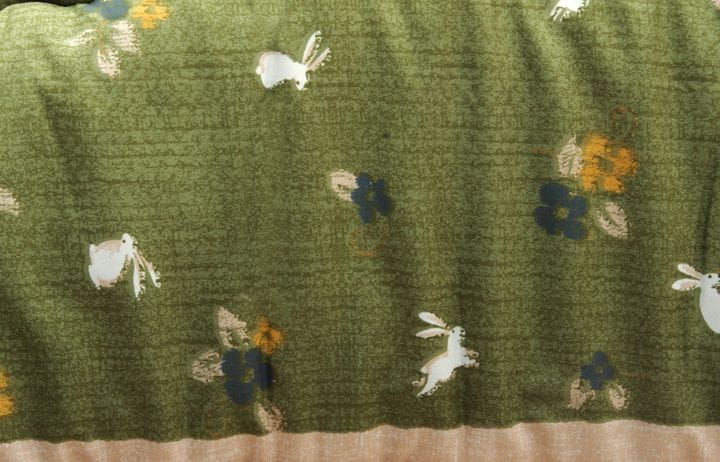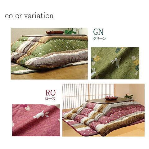 和調のウサギ柄こたつ布団です。こちらの商品は国内でわた入れをしています。側地にはポリエステル素材を起毛させた柔らかい生地を使用しています。部分暖房のこたつは電気代もおトクです。