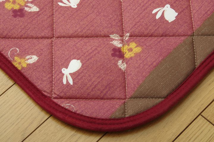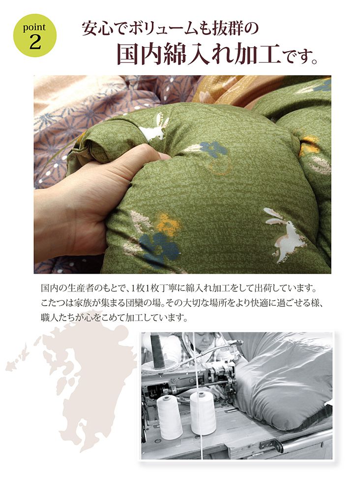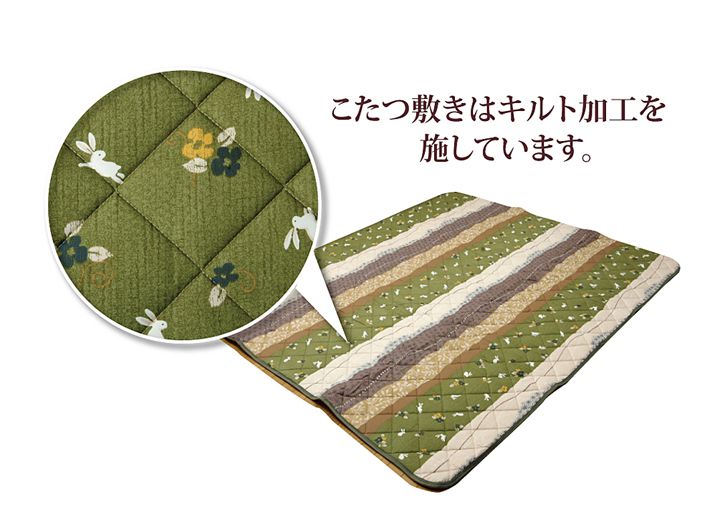 和調のウサギ柄こたつ布団です。こちらの商品は国内でわた入れをしています。側地にはポリエステル素材を起毛させた柔らかい生地を使用しています。部分暖房のこたつは電気代もおトクです。