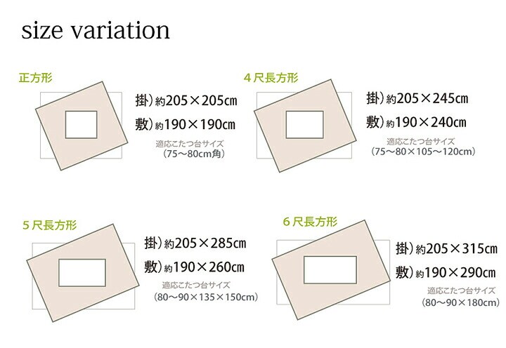約205×315cm(80~90×180cm幅のこたつ台に適応)