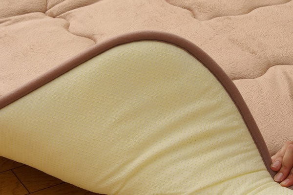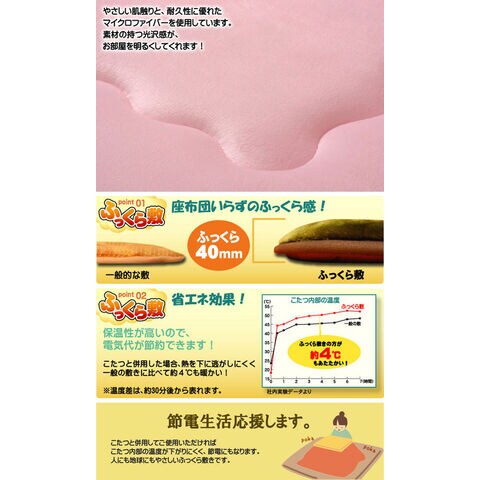 表地には肌触りが良く、耐久性に優れたマイクロファイバーを使用しています。中材にはクッション性にこだわった国産の固綿40mmを使用しています。十分な弾力性があるのでフローリングでのご使用にも最適です。遮音特級LL-30を取得しています。床下への騒音も軽減します。また、こたつと併用するとこたつの熱を床下へ逃しにくくなるので省エネ効果もあります。