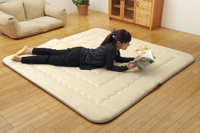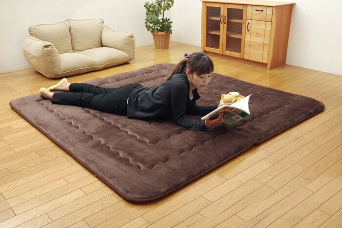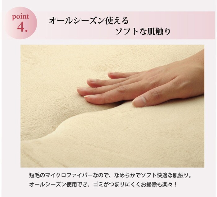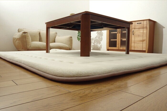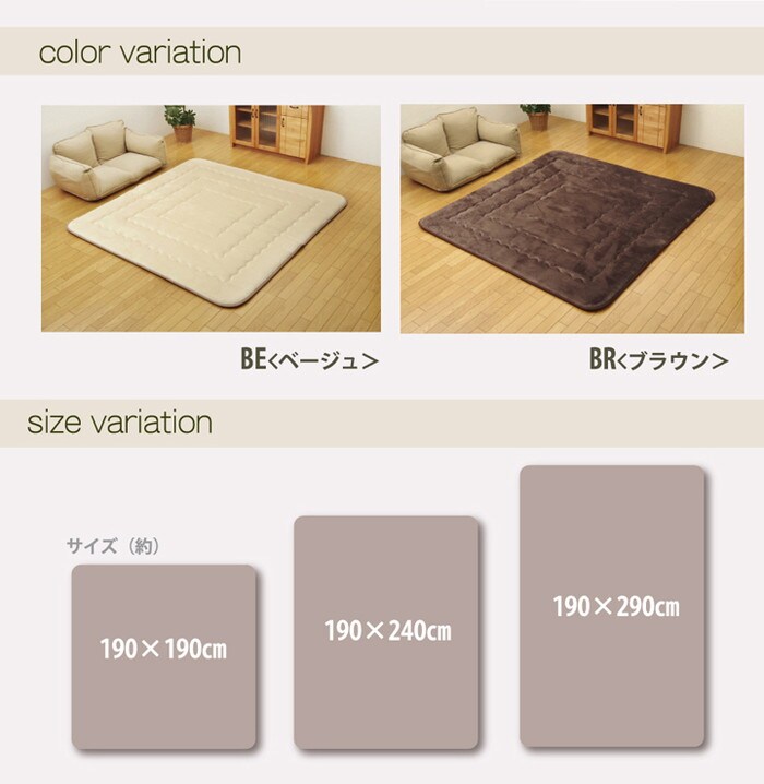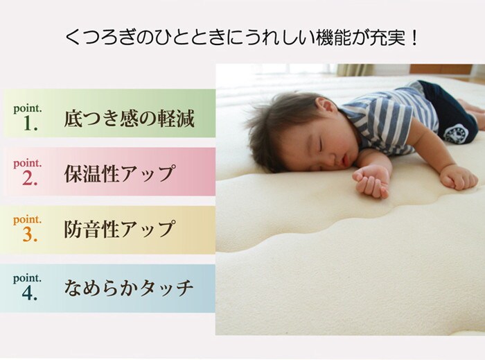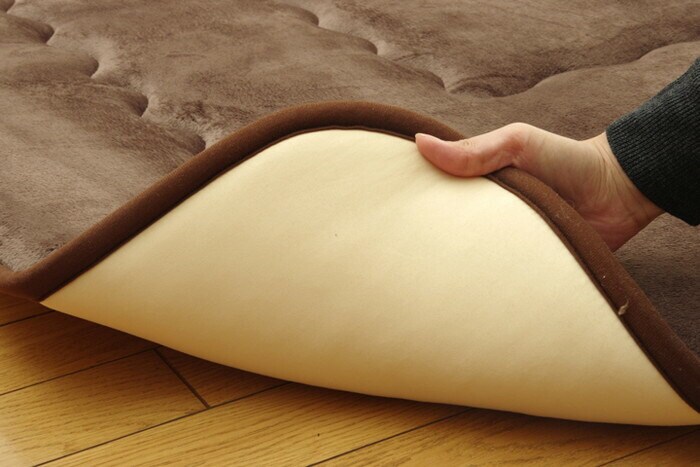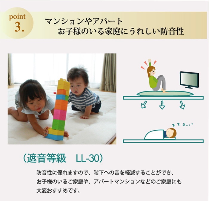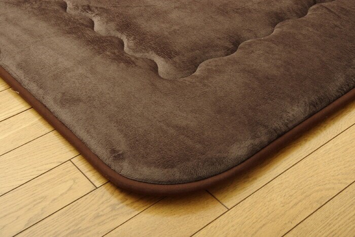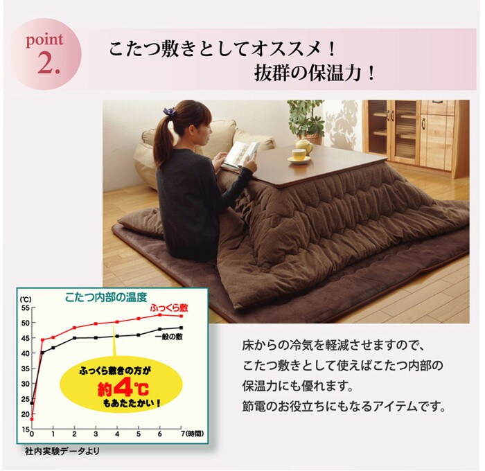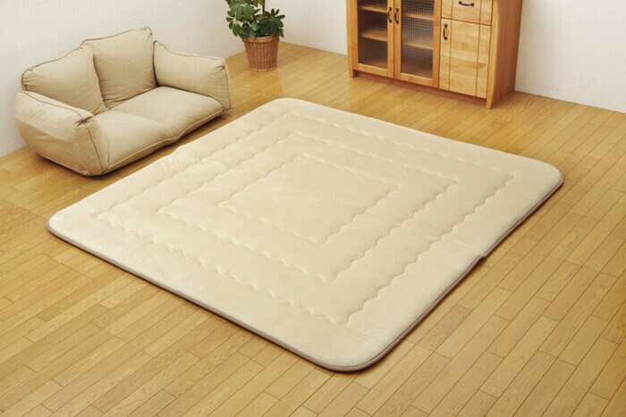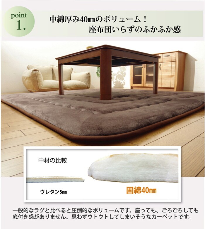 表地には肌触りが良く、耐久性に優れたマイクロファイバーを使用しています。中材にはクッション性にこだわった国産の固綿40mmを使用しています。十分な弾力性があるのでフローリングでのご使用にも最適です。遮音特級LL-30を取得しています。床下への騒音も軽減します。また、こたつと併用するとこたつの熱を床下へ逃しにくくなるので省エネ効果もあります。