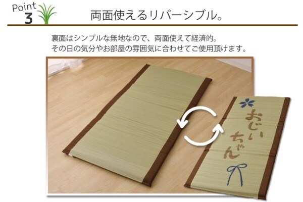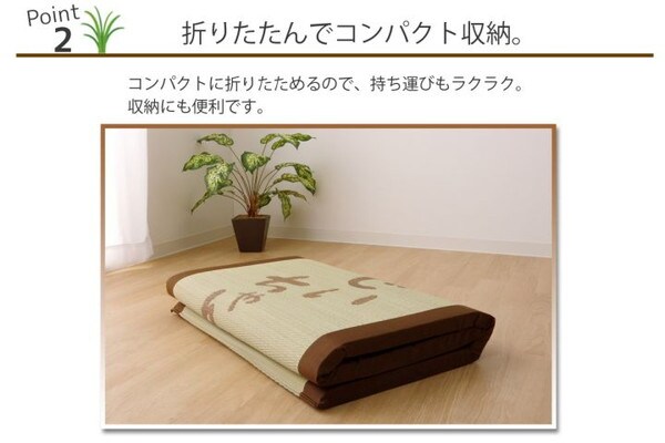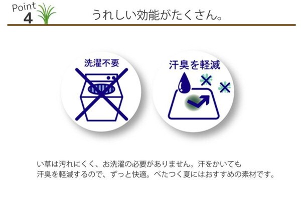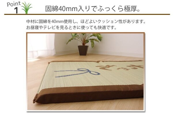 い草には1.綿の約3倍の吸湿性があり汗のじめじめを軽減します。2.湿度の調整作用があり、蒸れにくく快適な就寝を促します。3.汗のにおいの元となる化学物質を90%以上抑え、においを軽減します。などの効果があります。中材には固わた40mmを使用していますのでフローリングでも快適にご使用頂けます。い草に青森ヒバ加工を施しています。(抗菌・防臭効果)青森県のヒバの木から抽出した「ヒバ油」を現地に送り、メーカー独自の技術で材料や商品に加工しました。「ヒバ油」には、ヒノキチオールという天然物質としては極めて抗菌性の高い成分が含まれ、医療や食品など多分野で利用研究が進められています。