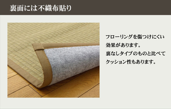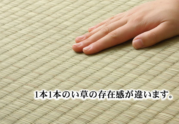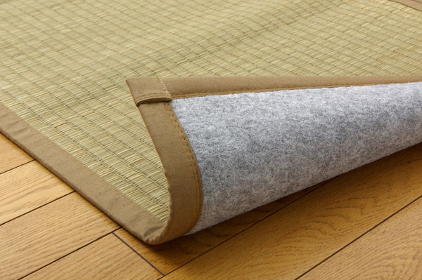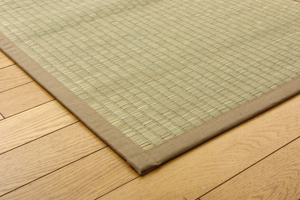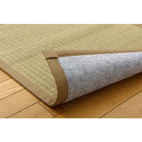 非常に希少価値の高い生地、「沖縄ビーグ」を使用したラグです。沖縄ビーグは通常のい草を原種としますが、何年もかけて沖縄の過酷な環境に適応した結果、太く丈夫に育ったい草の事を言います。本土のい草と比べ太さが約2~3倍、重量も約2倍程あり丈夫で長持ちします。その為い草特有の機能である湿気の吸放出効果も約2倍程となり、夏場のムシムシとした湿り気を吸収してくれる他、寝転がった時の汗のべとつき感の無さも抜群です。長年仕様すると徐々に表面がきれいな飴色に変わり、まるでワックスをかけたかのような光沢感が生まれるのも特徴です。