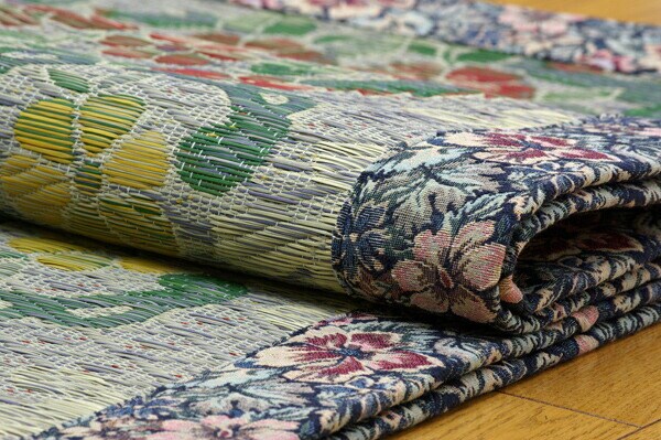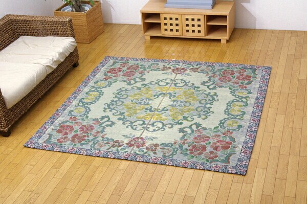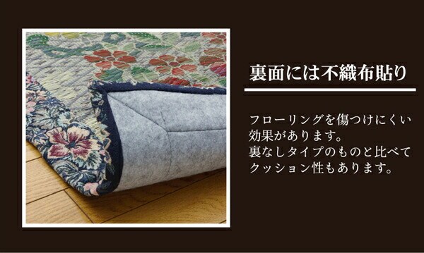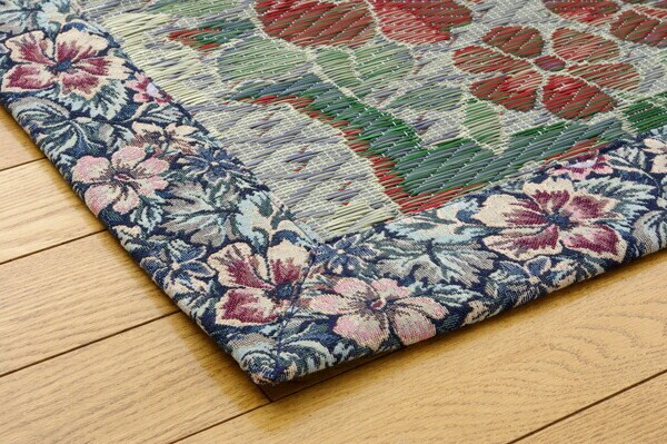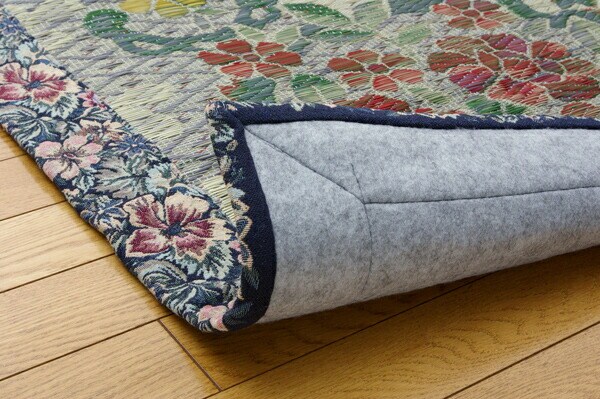 ヘリ部分にも花柄をあしらったエレガンスなデザインのい草ラグです。い草には空気の自然浄化作用、湿度の調節作用などがあります。また汚れにくく、使用するうちに黄金色に変化し味が出ます。い草に青森ヒバ加工を施しています。(抗菌、防臭効果)フローリングを傷つけにくいよう、裏には不織布を貼っています。
