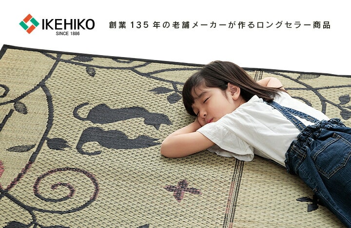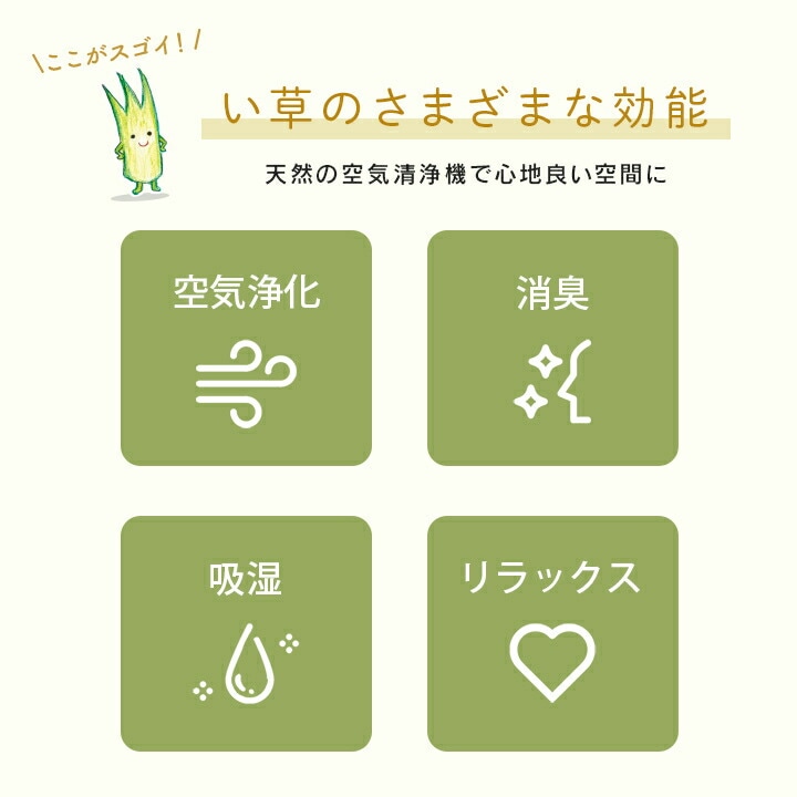 い草には空気の自然浄化作用、湿度の調節作用などがあります。フローリングを傷つけにくいよう、裏には不織布を貼っています。い草に青森ヒバ加工を施しています(抗菌、防臭効果)。青森県のヒバの木から抽出した「ヒバ油」をメーカー独自の技術で商品に加工しました。「ヒバ油」には、ヒノキチオールという天然物質としては極めて抗菌性の高い成分が含まれ、医療や食品など他分野で利用研究が進められています。