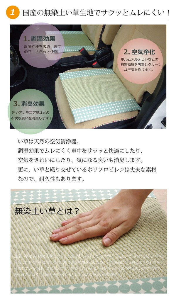 表地には国産のイ草を使用しています。い草には空気の自然浄化(消臭)作用、湿度の調節作用などがあり、長時間座った際のムレを軽減します。表地と中わたの間にダイワボウノイ株式会社のアレルプルーフを入れております。アレルプルーフの特長として・アレル物質を吸着、ダニの死骸や糞・花粉等のアレル物質を繊維上で吸着します・抗菌防臭、繊維上の黄色ブドウ球菌の増殖を抑制します、などがあります。中材には固わたを使用、ヘタリにくく適度なクッション性があります。ご家庭のクッションとしてもご使用頂けます。
