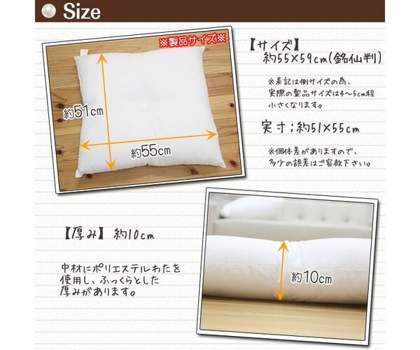 国内綿入れ加工をしているためふっくらとしたほどよいクッション性があります。お好きなカバーをかけてお部屋に合った座布団にできます。